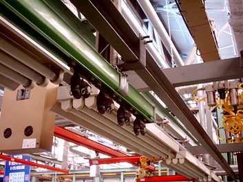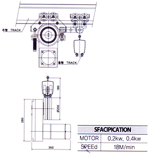| 더블거더 크레인은 두개의 거더 사이에 호이스트를 설치하기 떄문에 싱 글거더 크레인보다 더 높은 양정거릴를 가질 수 있다. 수동으로 쉽게 움 직일 수 있으나 6M이상의 스판으로 정격하중 500kg이상인 경우에는 아래그림과 같은 DRIVE UNIT를 사용하여 전동으로 움직일 수 있다. | ||||